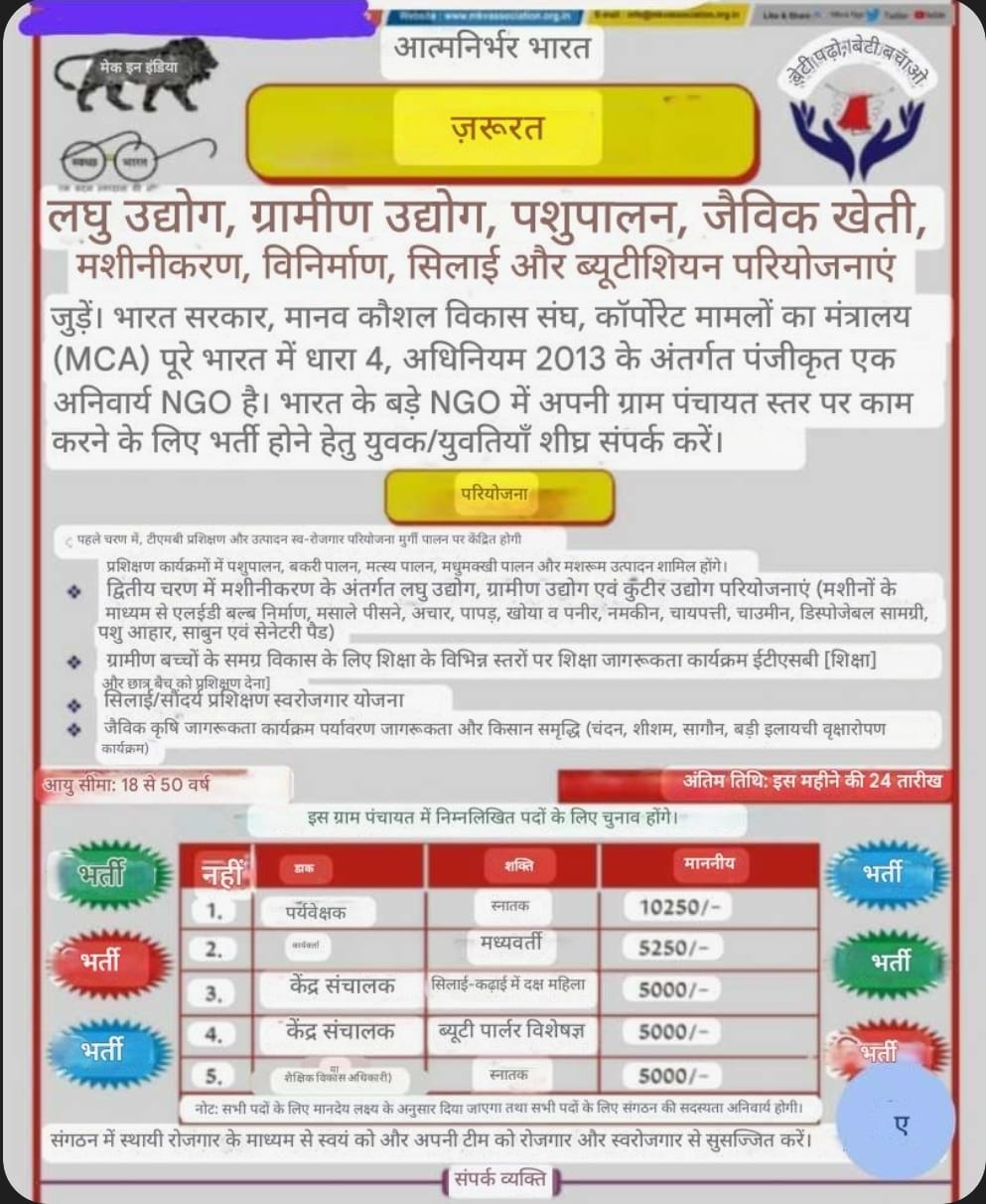 सूक्ष्म उद्योग, ग्रामीण उद्योग, पशुपालन, जैविक खेती, मशीनीकरण, उत्पादन, सिलाई और ब्यूटीशियन परियोजनाओं में भाग लें। भारत सरकार, मानव कौशल विकास समिति, कॉर्पोरेट मामलों के मंत्रालय (MCA) द्वारा धारा 8, अधिनियम 2013 के तहत पंजीकृत NGO, पूरे भारत में अनिवार्य है। युवा पुरुष/महिलाओं को उनके अपने ग्राम पंचायत स्तर पर काम करने के लिए भारत के बड़े NGO में नियुक्त होने के लिए जल्द ही संपर्क करना चाहिए।